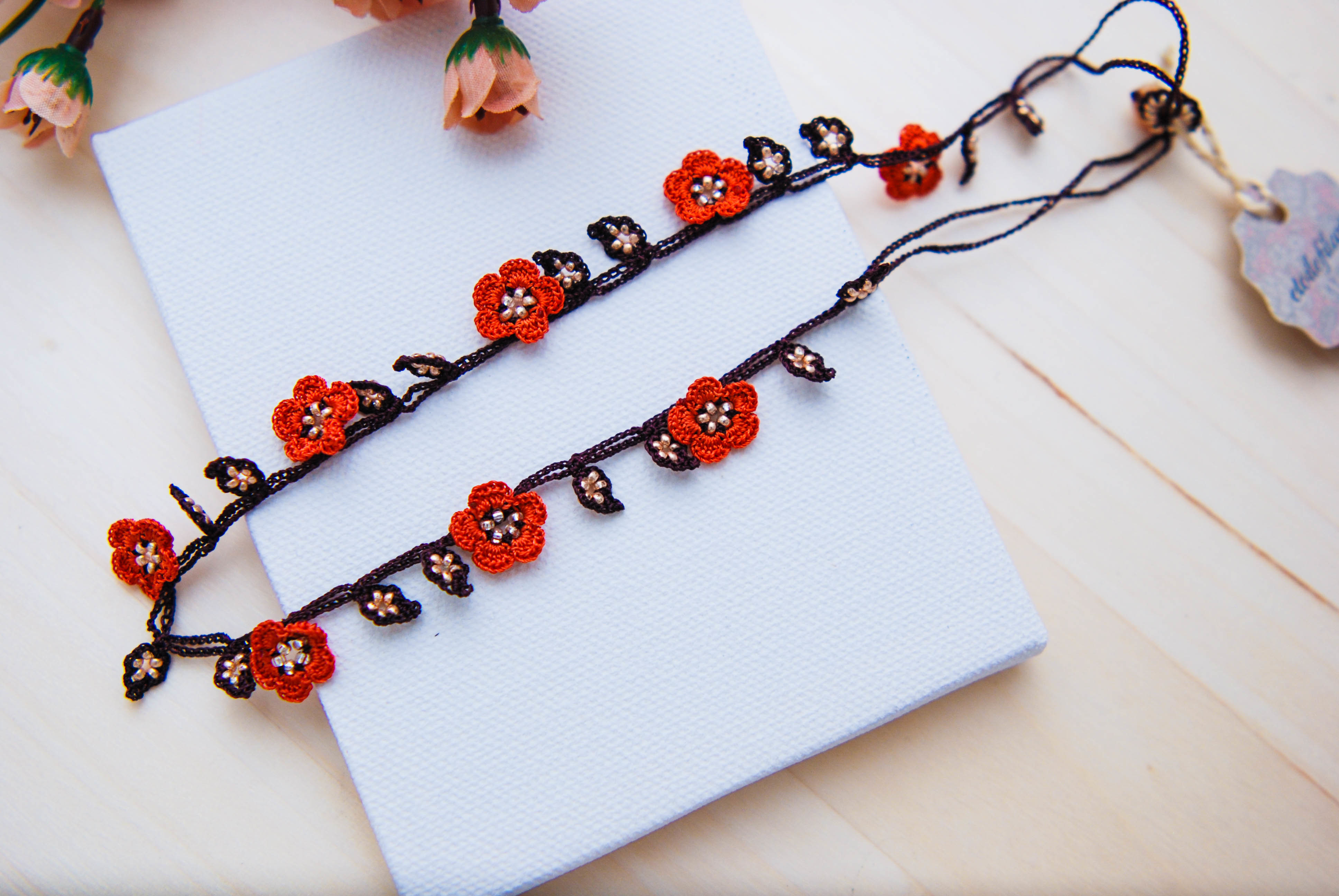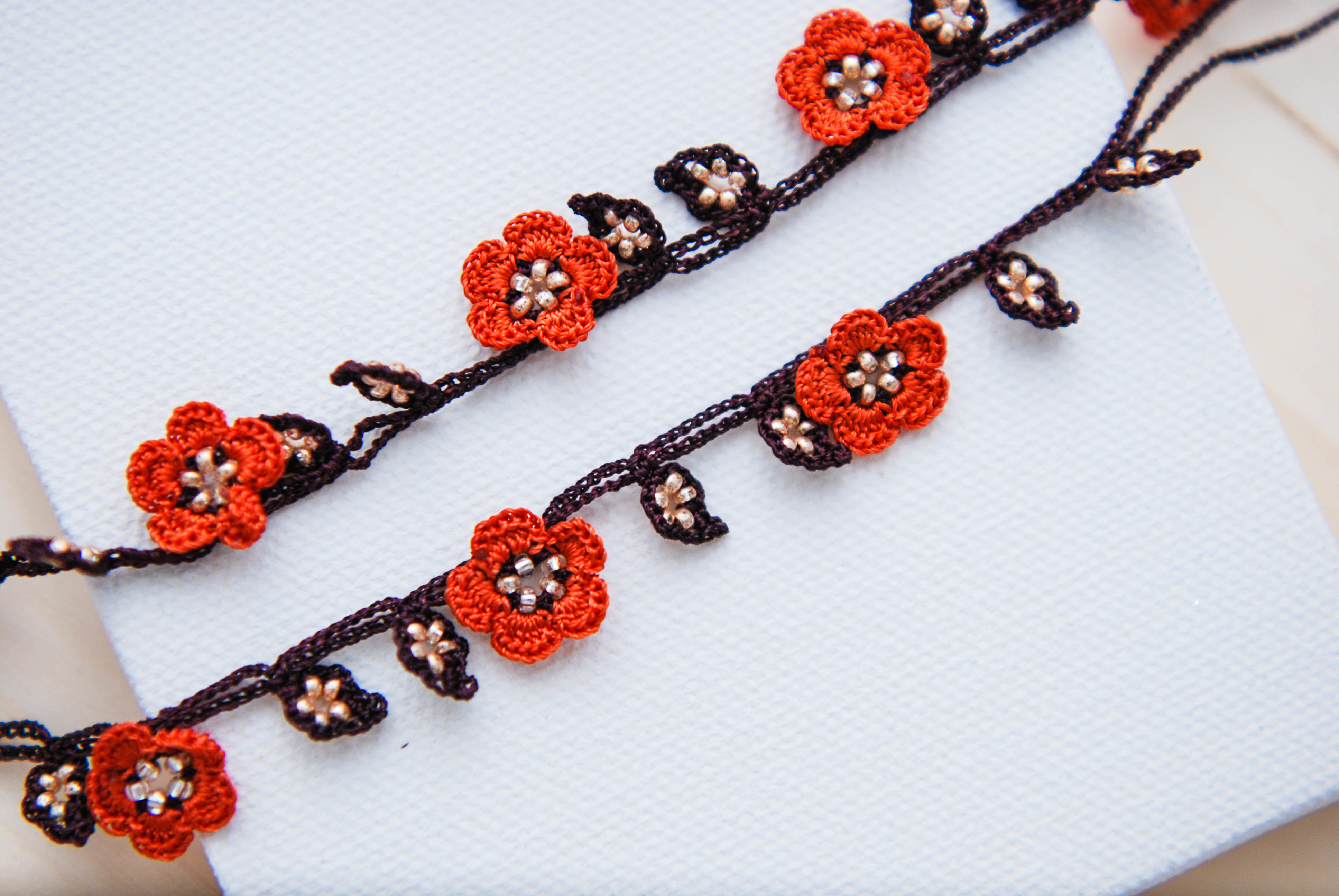 で編み上げたお花のアクセサリー。
